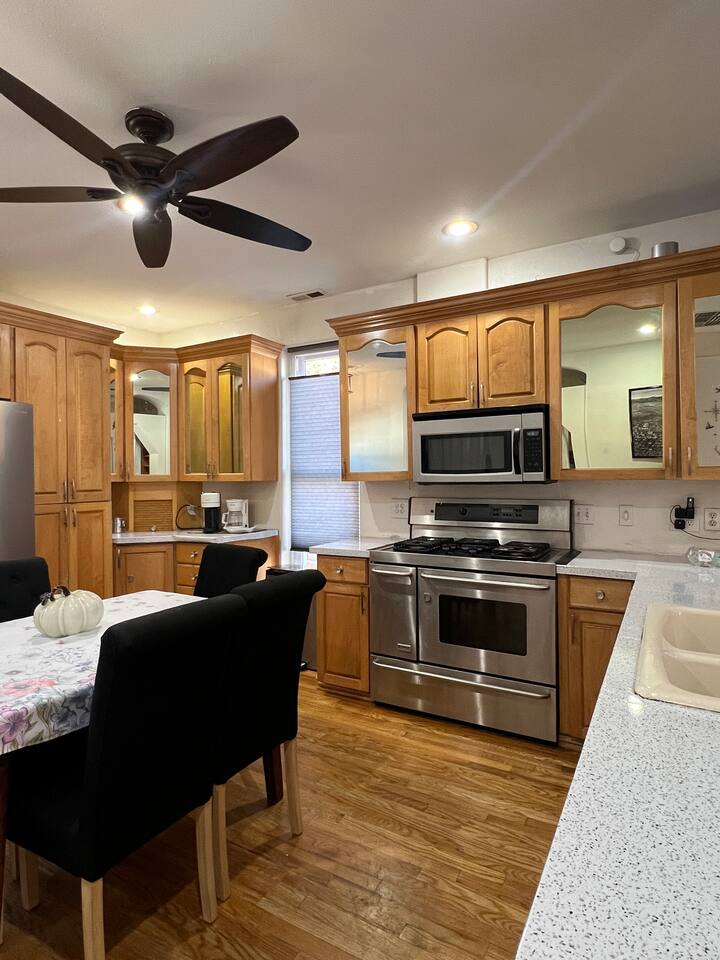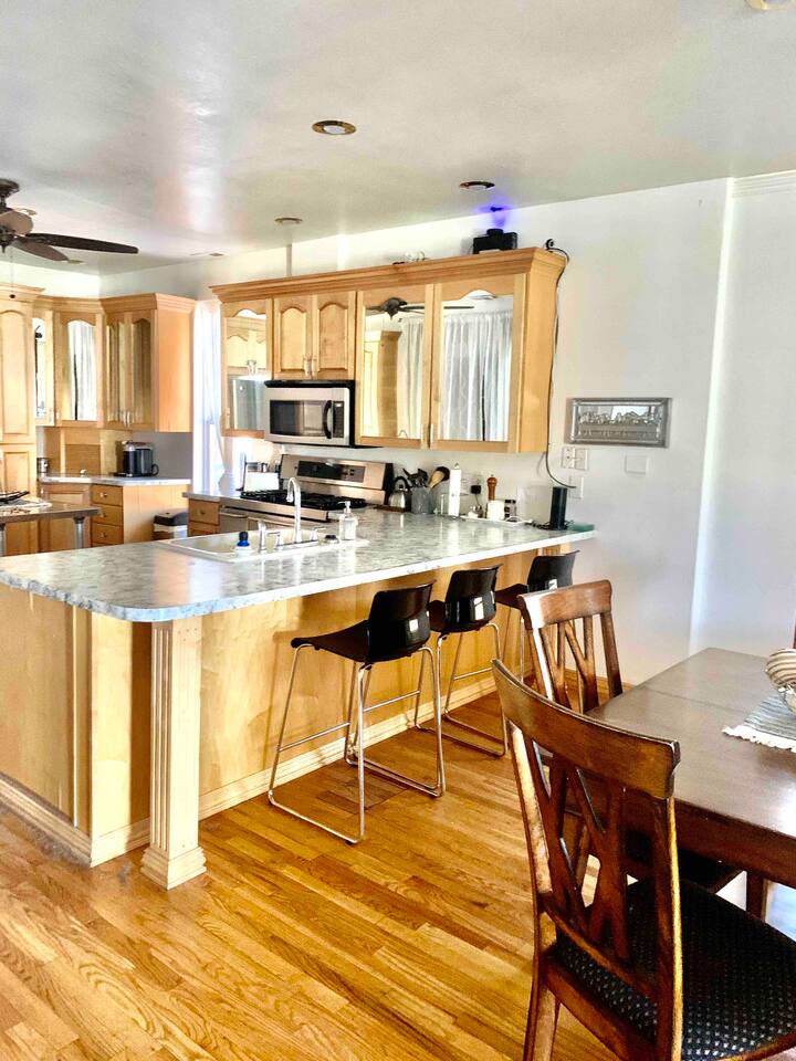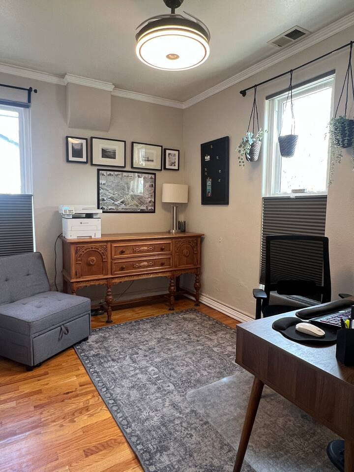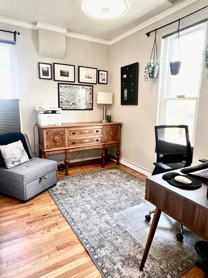 Beautiful older home (originally built in 1891) on a huge fully fenced lot with plenty of private parking. The house has solar panels and can produce enough electricity for your entire stay. There is a level 2 electric vehicle charger available in the driveway. House has two full bedrooms - one with a queen bed and one with a king bed, a dedicated office with a chair that converts to a (half width) single bed and a large bathroom. Huge kitchen with 5 burner gas stove. Lots of outdoor lounging space. You will have exclusive access to the home and back patio for your stay.